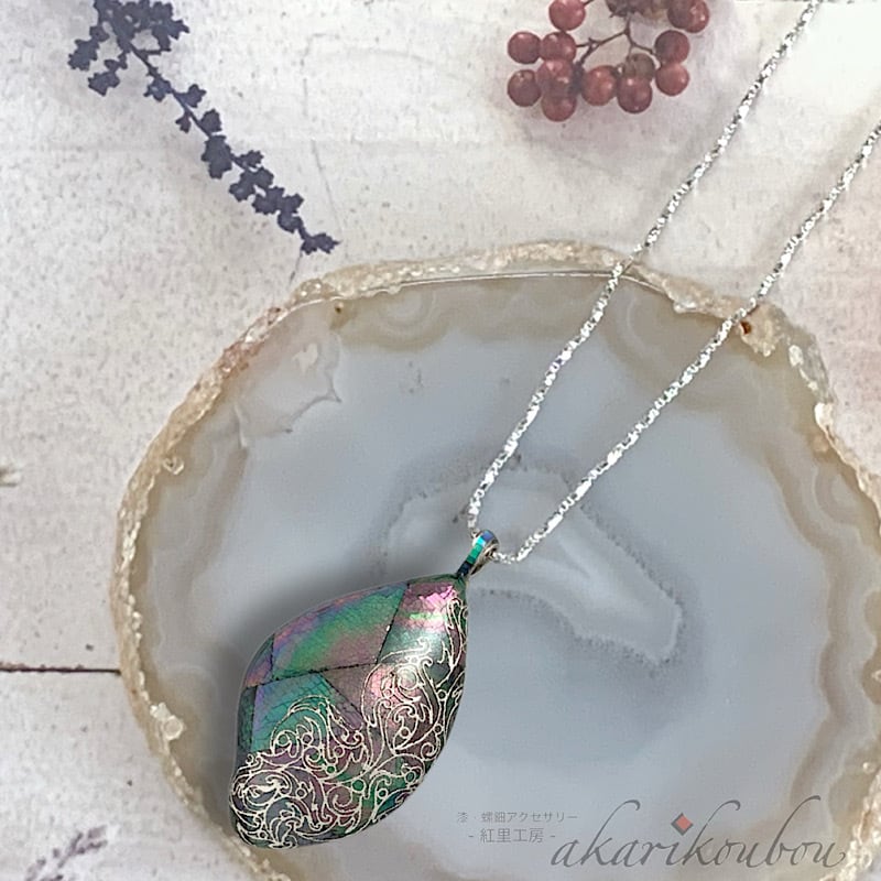 漆工芸の伝統技術を駆使して作られた、大きめの花びら型螺鈿ペンダントです。ブラックパールの母貝である黒蝶貝による精緻な螺鈿が施され、さらにプラチナ箔で唐草紋様が箔押しされています。