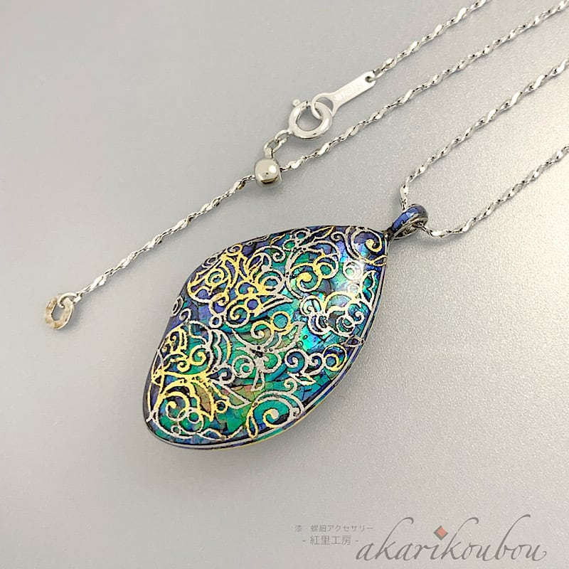 ふっくらとした花びら型の木地に、青みの強い鮑貝で螺鈿を施し、さらに金箔とプラチナ箔で唐草紋様を箔押しした瑠璃色の螺鈿ペンダント。見る角度によって変化する色味が華やかな一品。