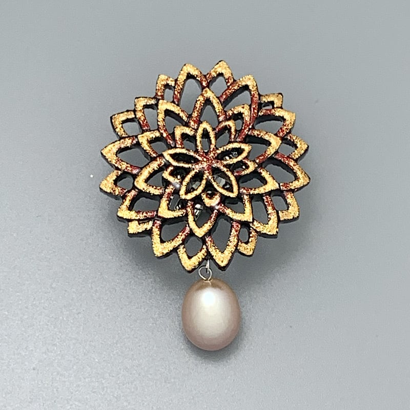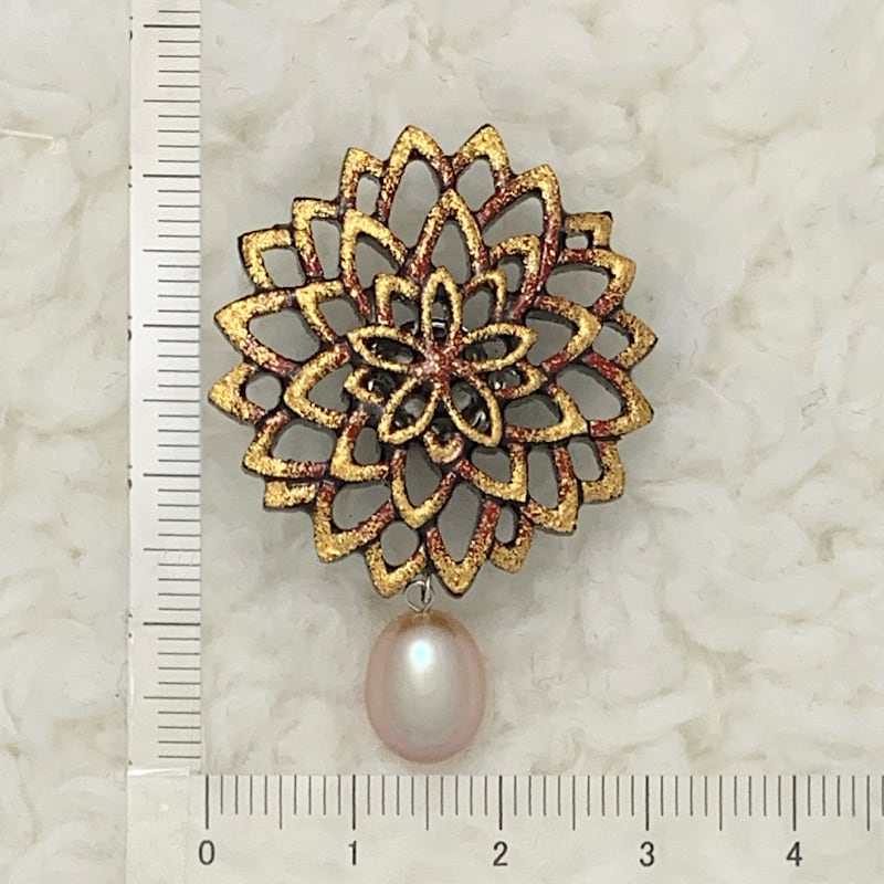 檜の木を透かし彫りに彫刻し幾重にも漆を塗り重ねた純金蒔絵ピンブローチ。