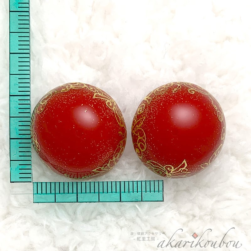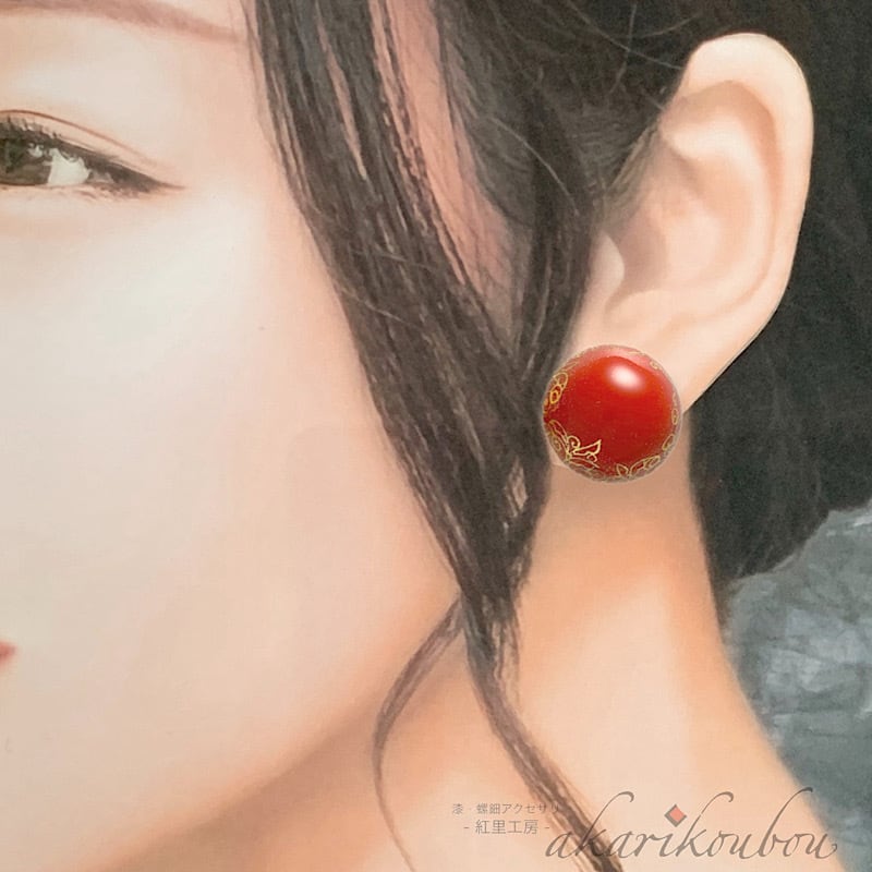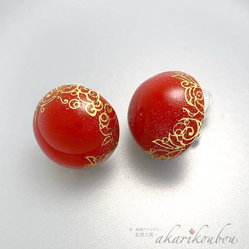 落ち着いた朱漆を地色に純金蒔絵のぼかし技法と純金箔の箔押し技法を用いた漆イヤリング。