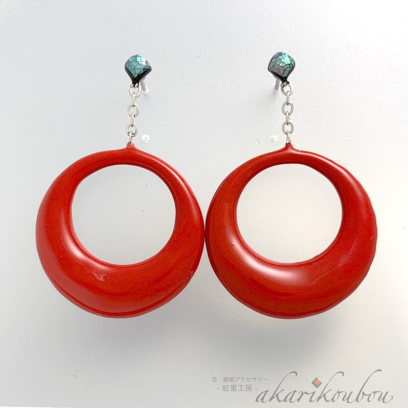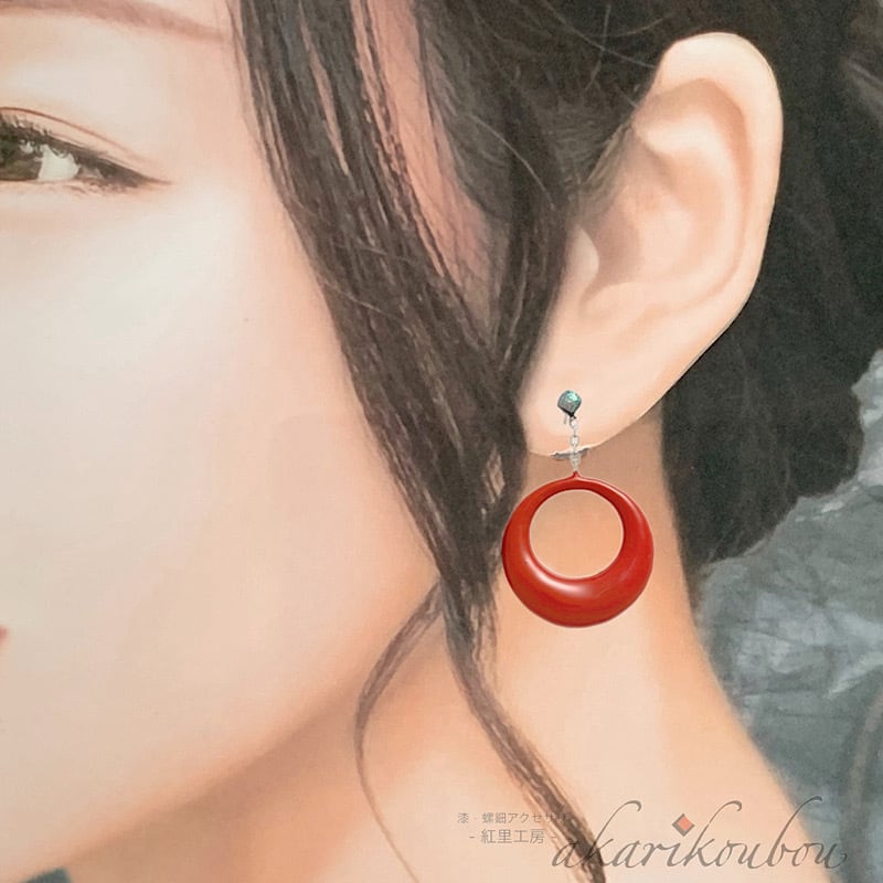 落ち着きのある朱漆で仕上げられたサークルリングのデザインが印象的なスイングピアスです。赤い漆の艶やかな輝きが、どんな装いにも華やかさをプラスします。プラチナポストを使用しているため、金属アレルギーを気にされる方でも安心してお使いいただけます。