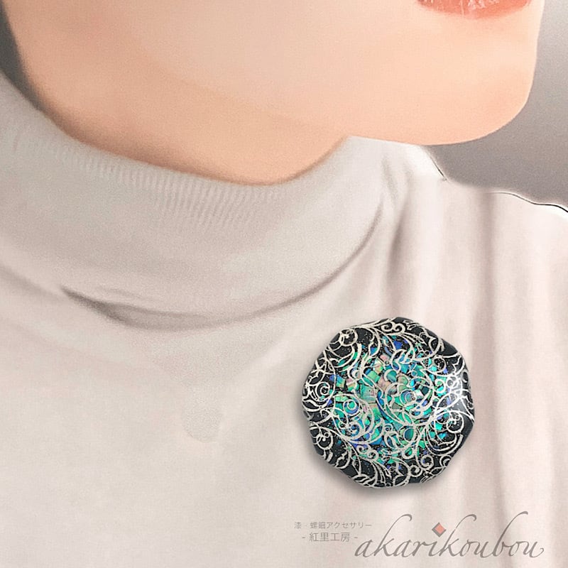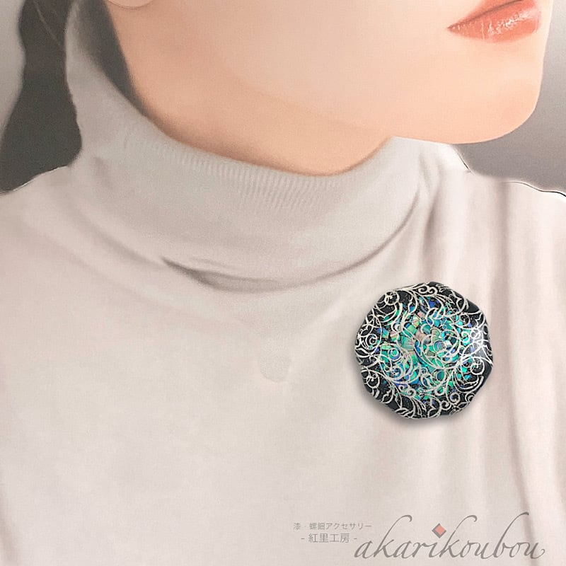 黒漆と金沢箔、そして美しい青貝の螺鈿を使用した贅沢なブローチです。独特のデザインが魅力的で、漆の深い質感がアクセントとなり、華やかさを引き立てます。
