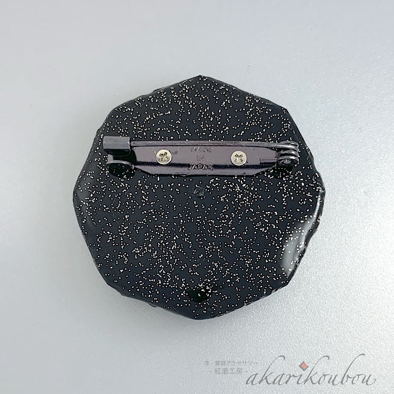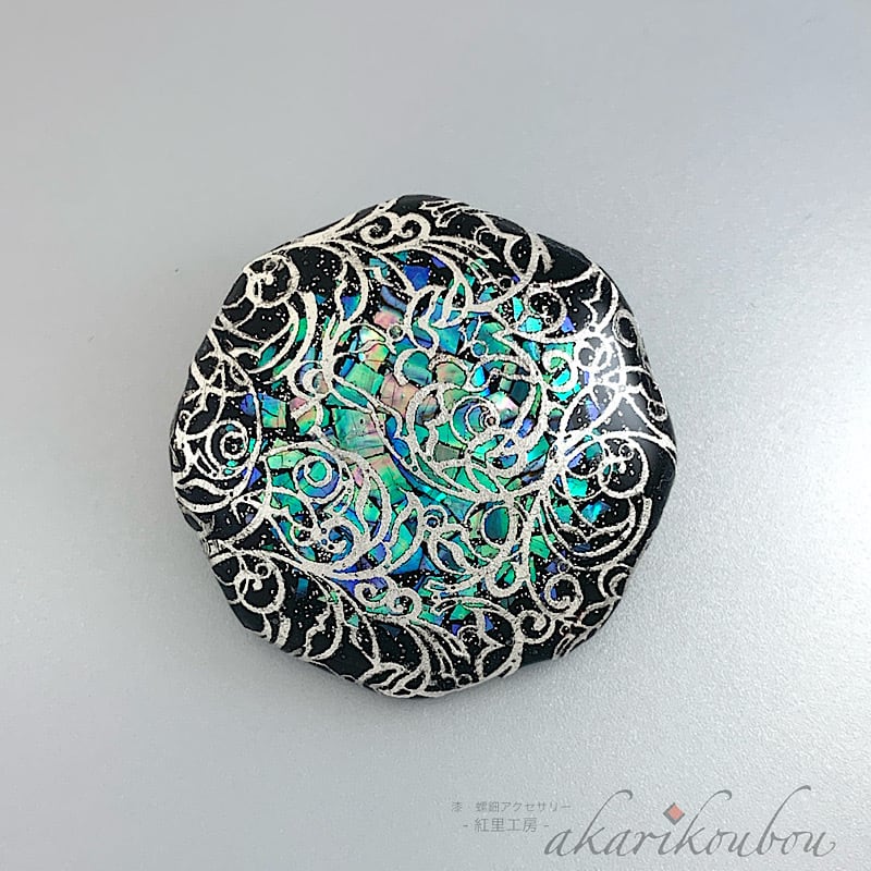 黒漆 金沢箔 螺鈿ブローチ 八角形 青貝螺鈿 プラチナ箔 漆アクセサリー:伝統工芸 金沢漆器 プラチナ箔ジュエリー