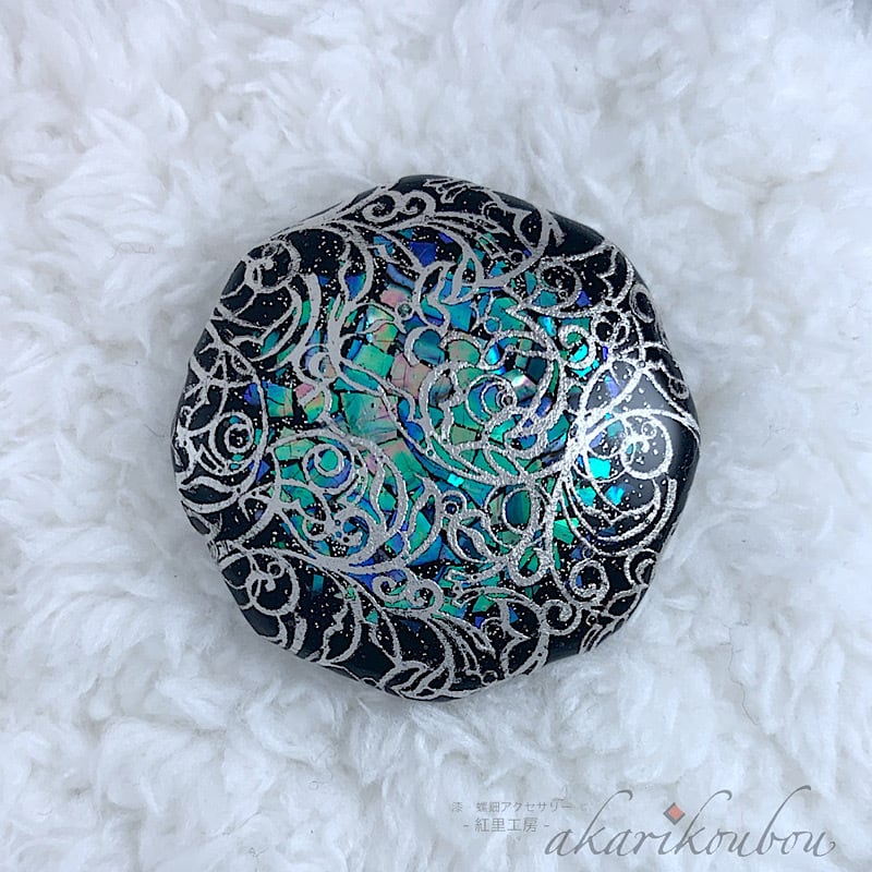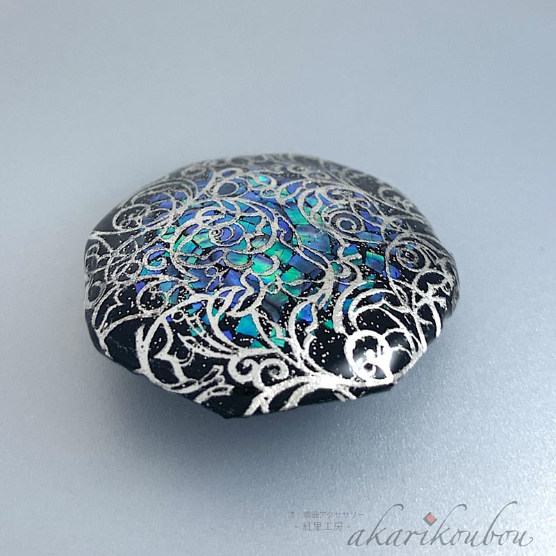 瑠璃色の螺鈿細工と純銀蒔絵を施した上に、プラチナ箔の唐草模様を重ねた重厚な作りのブローチに仕上げました。