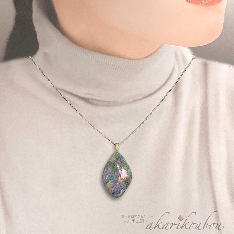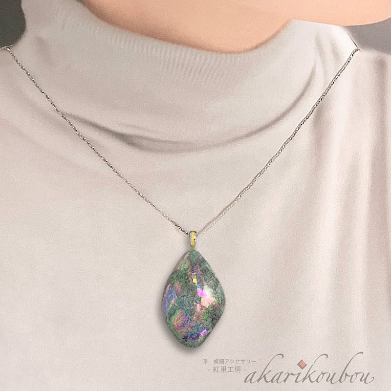 漆とプラチナ箔の変わり塗り施した花びら型の木地に、鮑貝を隙間なく貼り合わせることによって表現する美しいオーロラパール色の螺鈿ペンダント。見る角度によって変化する色味が華やかな一品です。