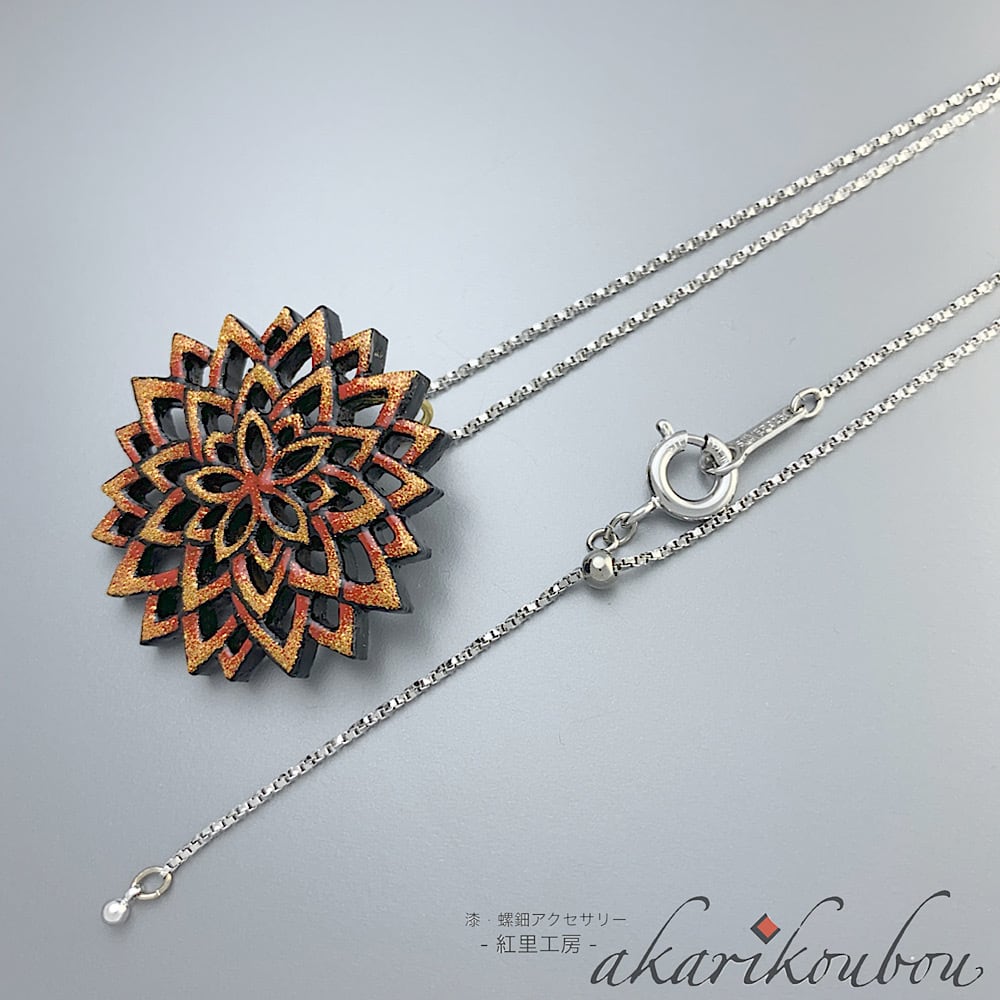 《予約商品》【sv925】漆ペンダント 赤 花透かし彫り 朱漆 金蒔絵 漆アクセサリー : silver925チェーン 純金粉 ロジウム フリーアジャスター 還暦プレゼント