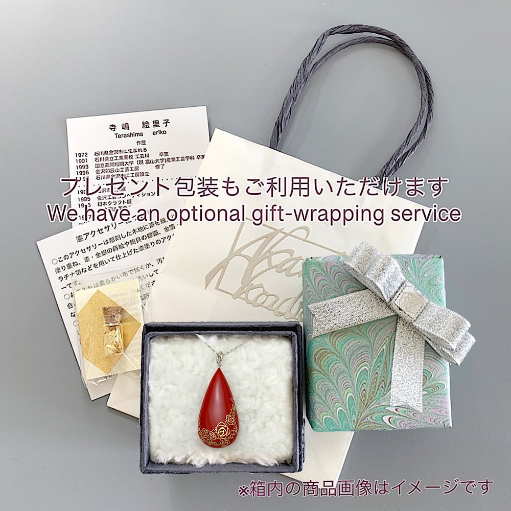薔薇の紋様は金沢の純金箔で箔押しされ、その華やかさと高貴さを一層引き立てています。また、朱漆塗りのティアドロップ型のペンダントは、女性の首元を優雅に飾ります。