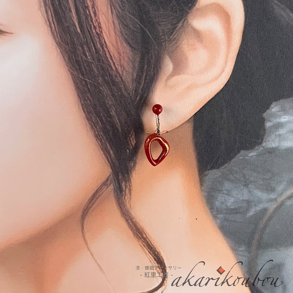 オープンハートの朱漆塗りイヤリング。本体上部から下にぼかすように純金蒔絵を施してあります。