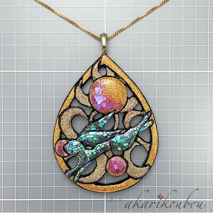 2025.5.21花びらをモチーフにした、美しい瑠璃色のペンダント。 螺鈿細工と金箔のふたつの工芸技術を駆使した一品で、紅里工房のオリジナルデザインです。 紅里工房の螺鈿は、鮮やかな色合いが特徴のメキシコアワビを使用。 螺鈿として使える部分が小さいので、小さく切った細かなパーツをひとつひとつ貼り合わせた貴重な一品です。