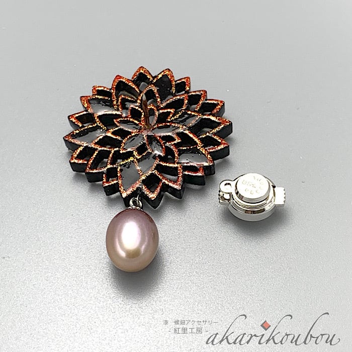 《予約商品》螺鈿×パールピンブローチ フラワーモチーフ 淡水パール 漆 螺鈿 純金箔 プラチナ箔 漆アクセサリー : 薄型キャッチ 金沢漆器 螺鈿ジュエリー