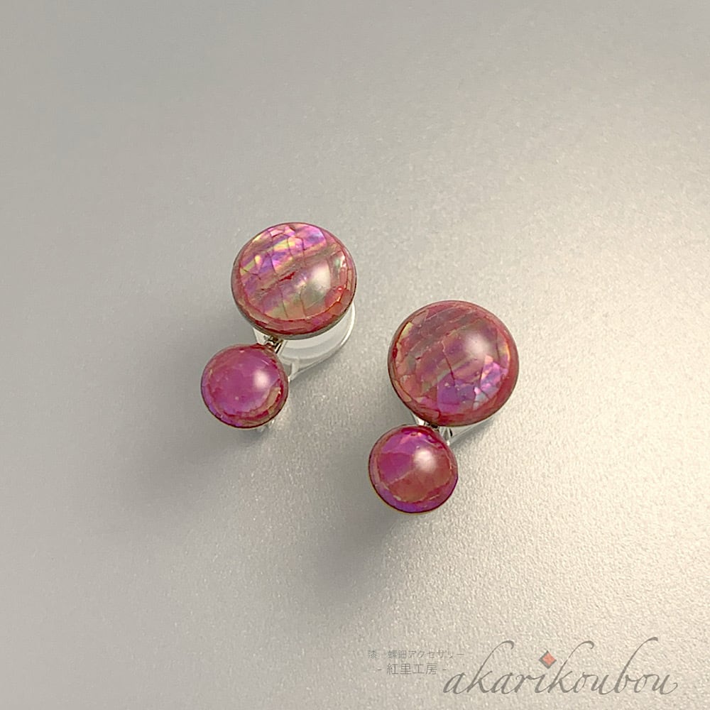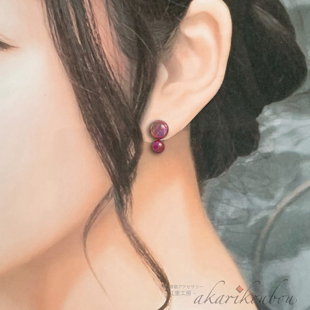 9mmと6mmのボタン型濃桃色螺鈿を組み合わせた印象的なデザインのイヤリングです。