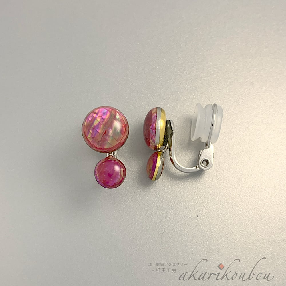 ブナの木に朱漆を塗り重ね、ピンク色系の螺鈿細工を施した螺鈿イヤリング。