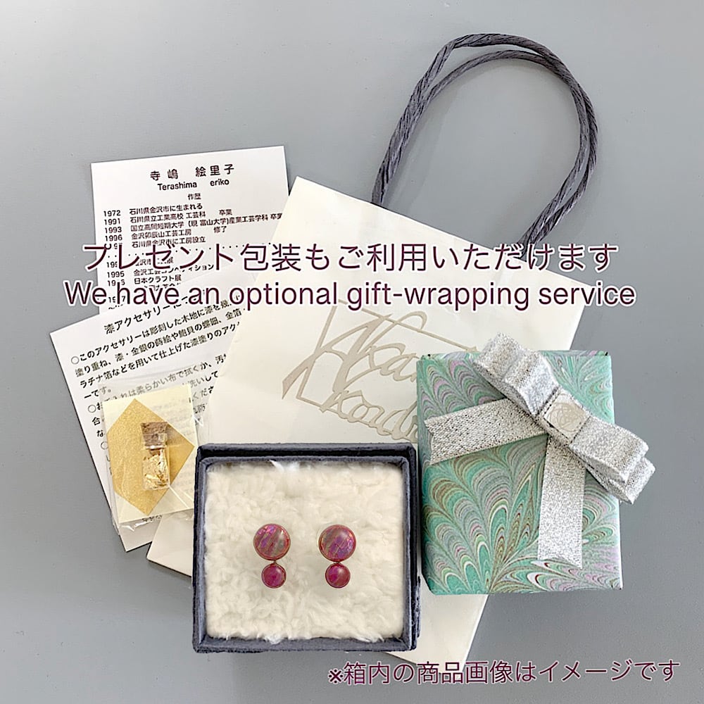 2024.10.18紅里工房では、漆や螺鈿ジュエリーのプレゼント包装も承っております。 大切な方へ贈り物や、ご自分へのご褒美には、既製品のようにどこでも手に入るものではなく、世界にひとつだけの漆アクセサリーや螺鈿ジュエリーがふさわしいでしょう。 どのジュエリーも、ほかには無い美しい色あいやユニークな形が特徴なので、人目を惹くのは明らか。 趣味の良さやハイセンスをかんじさせる一品ぞろいです。
