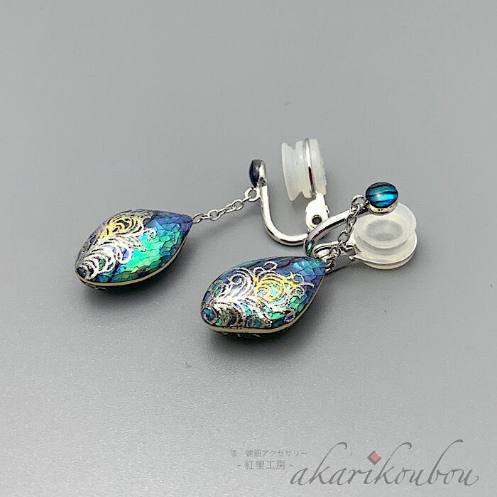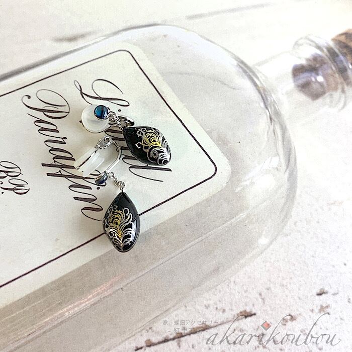 花びら型に彫刻した木地に、螺鈿細工とプラチナ箔・純金箔で孔雀の羽根模様を箔押しした面と、黒漆をベースに羽根模様を箔押しした、セパレートタイプの漆塗り螺鈿イヤリング。