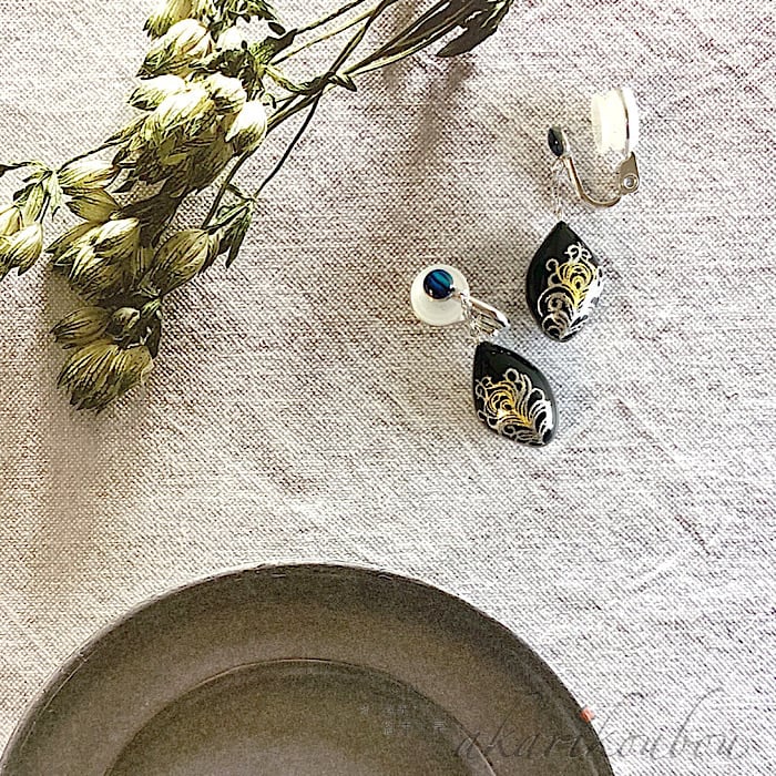 2025.9.17黒漆に金沢箔をあしらった、ハイセンスなイヤリング。 漆黒の漆を基盤に、純金箔とプラチナ箔とで、繊細な唐草模様を施しました。 唐草模様がない黒漆のスペースを敢えて設けることで、ゴージャスになりすぎず、上品なデザインに仕上げました。 特別な日や、大切な人へのプレゼントにいかがでしょうか。 ピアスへの変更も可能ですので、お気軽にご相談ください。