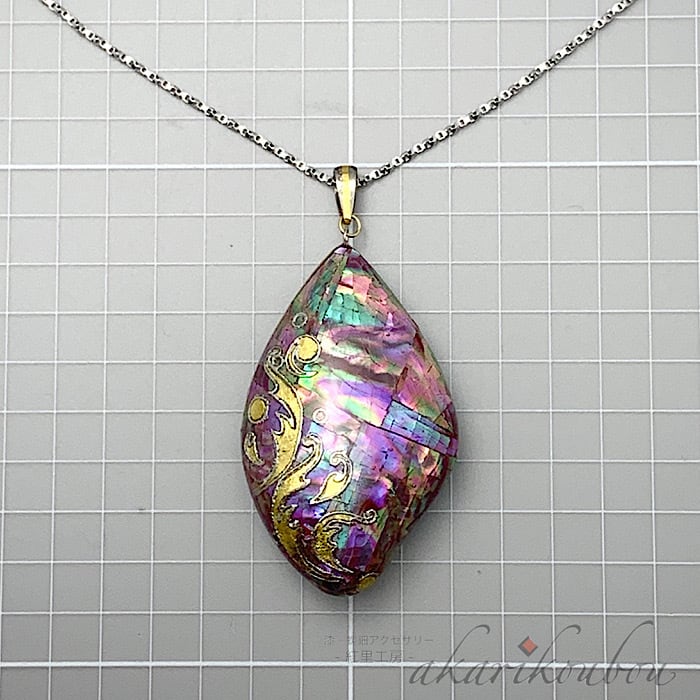 このペンダントは、瑠璃色の螺鈿とピンクの螺鈿が美しいコントラストを生み出し、華やかでありながら上品さも演出します。身につけるたびに異なる表情を見せるリバーシブル機能は、どんなコーディネートにもマッチし、さまざまなシーンで活躍します。