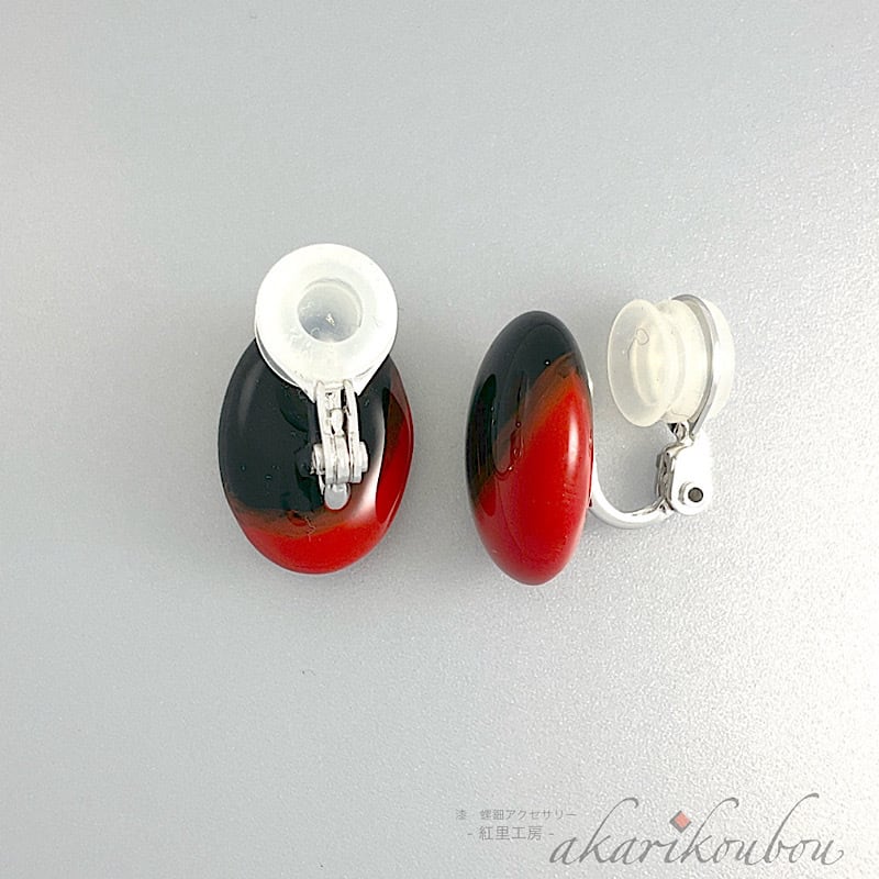 赤と黒のぼかし塗り楕円形漆イヤリング。黒漆の比重を多めにした飽きが来ない使いやすい定番のイヤリング。