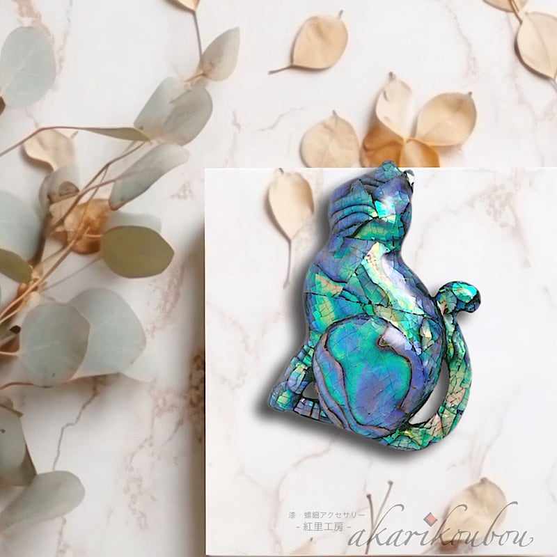 美しい青貝螺鈿が愛らしい猫のモチーフと絶妙に組み合わさった、上品で華やかなアクセサリーです。繊細な螺鈿の技術が光るデザインは、上品さと存在感を兼ね備えています。